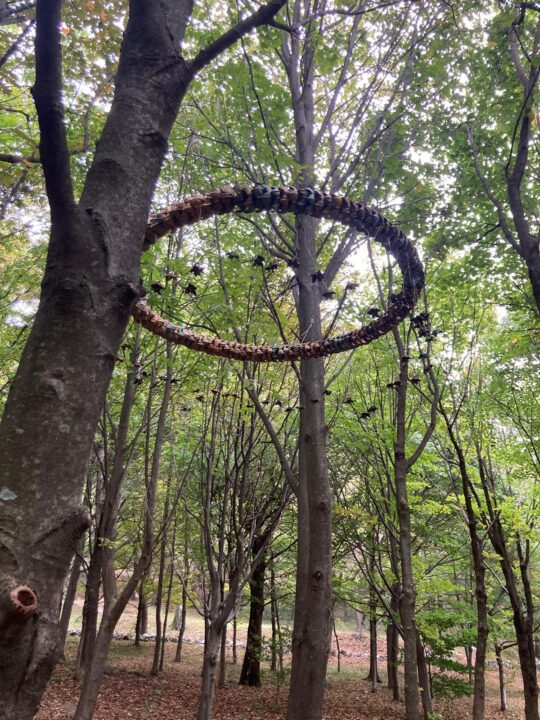 Segue l’opera “Nuove Migrazioni” di Mattia Ponziani posta sul sentiero che da Baita Vinargino scende verso Piazzale 400, girando a sinistra ai “bomboloni” abbandonati.